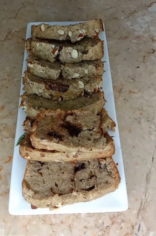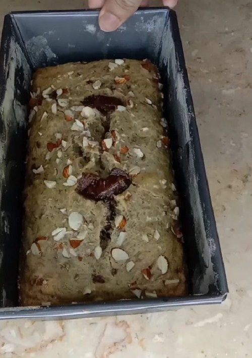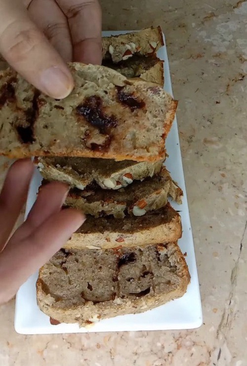 نتأكد من نضج الخبز عن طريق إدخال عود أسنان في وسط الخبز. إذا خرج نظيفًا، فهذا يعني أن خبز الموز جاهز! أخرجه من المقلاة واتركه يبرد قليلاً قبل تقطيعه إلى قطع سميكة ورطبة. أفضل ما في خبز الموز هذا هو قوامه الرطب الذي لا يقاوم، مما يجعل كل قضمة تجربة ممتعة. قدميها دافئة مع كمية من الكريمة المخفوقة أو مغرفة من آيس كريم الفانيليا للحصول على متعة إضافية.