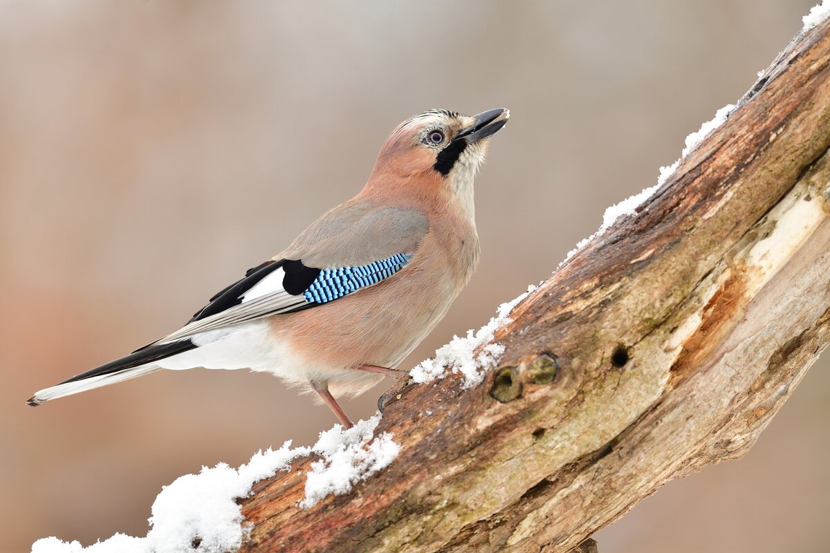 The Eurasian Jay is a medium-sized bird, characterized by its flamboyant plumage. With a pinkish-brown body, striking blue patches on the wings, and a distinctive black ‘moustache,’ it’s truly a marvel to behold. The combination of these colors gives the bird a unique and eye-catching appearance.