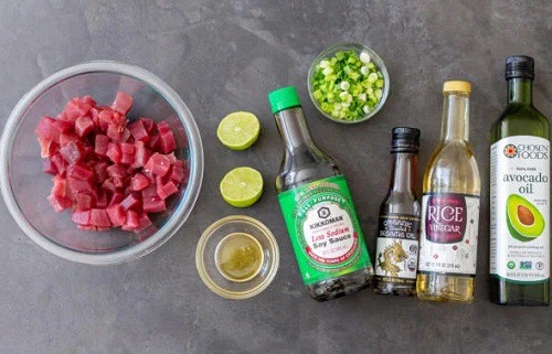 At the heart of every Hawaiian Poke Bowl lies the exquisite Poke Marinade. Begin your culinary adventure by selecting 12 oz of sushi-grade tuna or salmon, cut into tantalizing cubes. In a mixing bowl, combine 2 tbsp of soy sauce, 2 tbsp of rice vinegar, 1 tbsp of oil, 1 tbsp of lime juice, 2 tbsp of sesame oil, and a teaspoon of honey. This flavorful concoction, enhanced with the freshness of chopped green onions, forms the foundation of your Poke Bowl, infusing it with authentic Hawaiian taste.