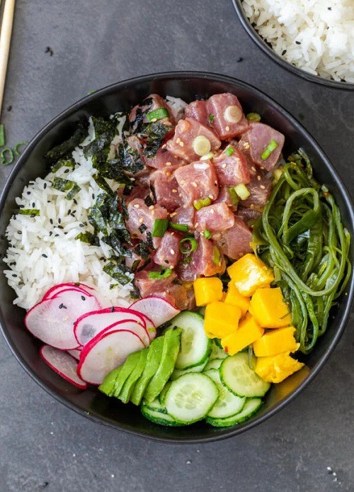 Presentation is key to making your Hawaiian Poke Bowl not only a culinary delight but also a visual masterpiece. Take your time to arrange the ingredients thoughtfully, creating a harmonious balance of colors and textures. The vibrant hues of the mango and avocado, combined with the deep green of the seaweed and the vibrant red of the radishes, make your dish visually appealing, enticing your guests before they even take the first bite.