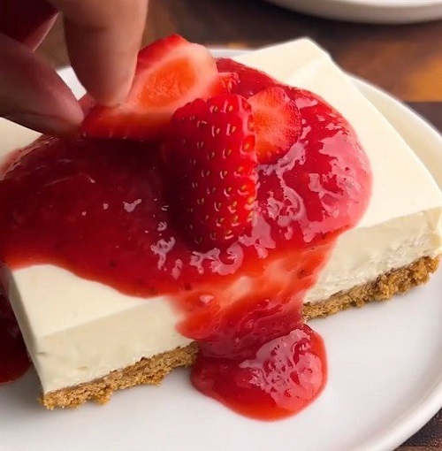 Now comes the exciting part – adding the fresh strawberry topping! Slice the strawberries and arrange them on top of the cheesecake layer. You can get creative with the arrangement, making it as decorative as you like. The bright red strawberries not only look visually appealing but also provide a burst of juicy sweetness with every bite.