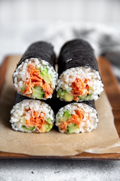 Let’s kick things off by preparing the star of our show: the Spicy Salmon Salad. Begin with a pound of wild salmon, seasoned generously with salt and freshly ground black pepper. Add a zingy touch with a tablespoon of fresh lime juice and a teaspoon of low-sodium tamari or soy sauce. Grate in a clove of garlic and a teaspoon of freshly grated ginger to infuse the salmon with aromatic flavors. To give our salad its signature kick, mix in three tablespoons of mayonnaise and adjust the heat to your liking with two to four teaspoons of Sriracha. The result? A spicy, tangy, and creamy salmon salad that will form the flavorful core of our sushi burrito wraps.